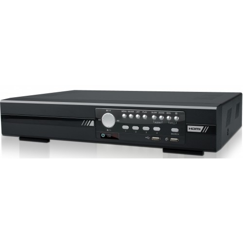 Compression améliorée H.264 avec un maximum de 120 IPS (720P), ce qui permet d'obtenir 25 IPS en 1280x720P pour chaque canal (vision continue). Qualité d'image en enregistrement configurable à 4 niveaux, et avec diverses méthodes d'enregistrement : manuel, continue, par détection de mouvement, par alarmes ou activation à distance. Stockage sur disque interne SATA jusqu'à 2 TB. Il dispose de 4 entrées et 1 sortie alarme NO/NC. Contrôle des caméras PTZ par port RS485. Menu OSD en français accessible par télécommande (inclus) et souris (non inclus).Backup externe par mémoire USB et réseau ethernet.